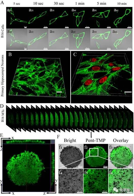 图2. (A) B16细胞以探针孵育不同时间后未经洗涤的荧光图与明场叠加图;原代海马神经元细胞以(B) 探针、(C) 探针和细胞核染料孵育1分钟后的荧光图;(D)多细胞肿瘤球0-120微米的Z轴层扫荧光图;(E) 多细胞肿瘤球的x-y、x-z、y-z轴的荧光强度分布图;(F) Z轴为60微米处的层切图。比例尺:(A-C) 20微米,(D,f1-f3) 200微米,(f4-f6)100微米。除了体外染色,探针也可以对活体斑马鱼进行染色。探针可以穿透常规染料无法渗入的斑马鱼表面的粘膜层,对其表皮细胞进行染色(图 3A-C)。此外,探针也可进入斑马鱼眼组织,对其眼部结构进行部分成像(图 3D)。