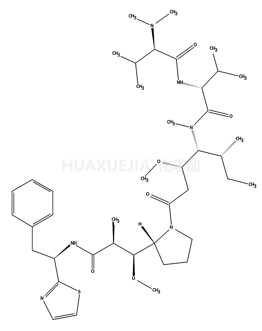 | 英文名 | L-Valinamide, N,N-dimethyl-L-valyl-N-[2-methoxy-4-[2-[1- methoxy-2-methyl-3-oxo-3-[[2-phenyl-1-(2-thiazolyl)ethyl] amino]propyl]-1-pyrrolidinyl]-1-(1-methylpropyl)-4-oxobutyl]-N-methyl-, [2S-[1[1R*(R*),2S*],2R*[1S*,2S*,3(R*)]]]- | ||||